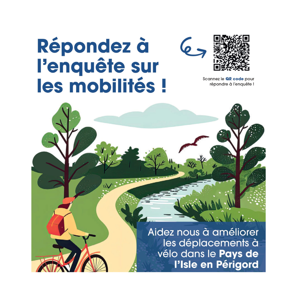 Dans le contexte du Schéma Directeur des Mobilités Actives, le Pays de l’Isle en Périgord propose un questionnaire en ligne, afin de recenser les besoins des usagers cyclistes et leurs pratiques actuelles (différents types d’utilisateurs, itinéraires empruntés, difficultés rencontrées…) ; le comportement des non-usagers pourra être envisagé pour compléter le diagnostic.